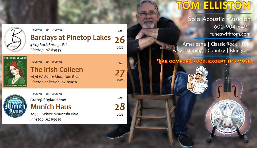 In addition to my own compositions, I cover a variety of music, including Americana, Classic Rock, Folk, Easy Listening, Country, and Bluegrass. My song list is extensive and I do take requests!