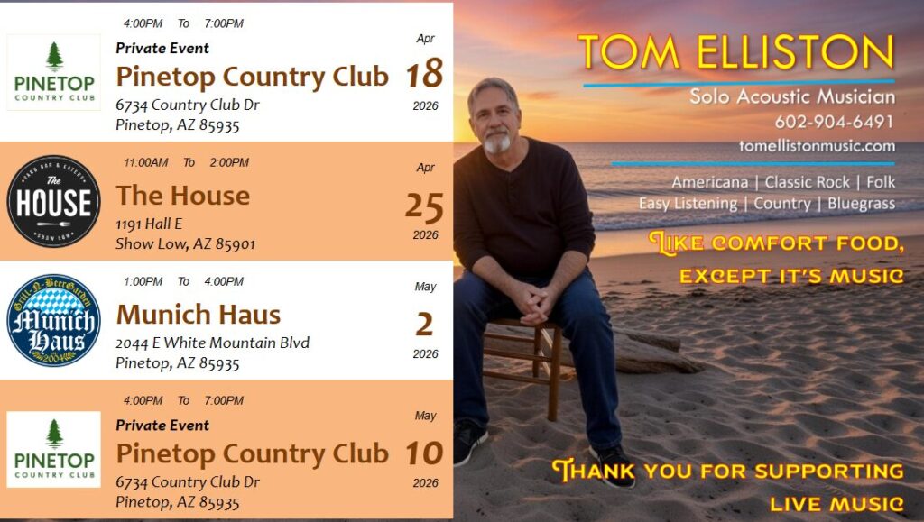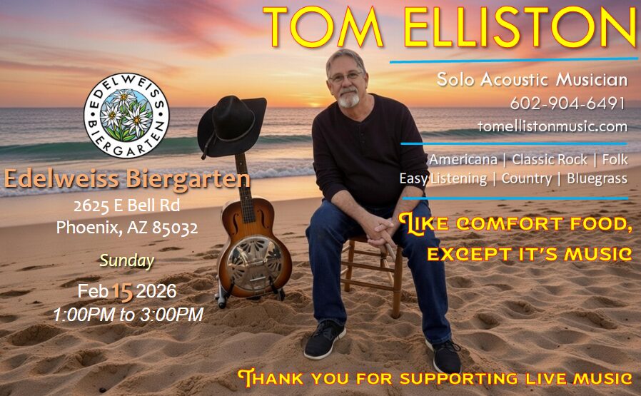 In addition to my own compositions, I cover a variety of music, including Americana, Classic Rock, Folk, Easy Listening, Country, and Bluegrass. My song list is extensive and I do take requests!